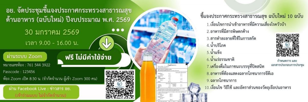 การประชุมชี้แจงประกาศกระทรวงสาธารณสุขด้านอาหาร ฉบับใหม่ ประจำปีงบประมาณ พ.ศ. 2569 มกราคม 30, 2026กุมภาพันธ์ 3, 2026webmasterข่าว การประชุมชี้แจงประกาศกระทรวงสาธารณสุขด้านอาหาร ฉบับใหม่ ประจำปีงบประมาณ พ.ศ. 2569 วันที่ 30 มกราคม 2569 เวลา 9.00 – 16.00 น. ผ่านทางระบบ Zoom meeting และ Facebook Live : ข่าวสาร อย. ที่ลิงค์ (1) https://www.facebook.com/share/v/1AQgdntJKw/ และ (2) https://www.facebook.com/share/v/1KX64B9JeJ/ 1. Zoom meeting เปิดห้อง Zoom 8.30 น. จำกัดจำนวนผู้เข้าร่วม 300 คน Meeting ID: 761 544 3922 Passcode: 123456 2. Facebook Live : ข่าวสาร อย. ไม่จำกัดจำนวนผู้เข้าร่วม ลิงค์ https://www.facebook.com/oryorfanclub/live_videos?locale=th_TH 3. กำหนดการ และเอกสารประกอบการประชุม ลิงค์ https://drive.google.com/drive/folders/1r6ulxdfdBlb5jky-Iv8PxCNQeaVSL_J6?usp=sharing